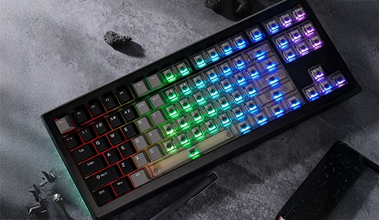 Côté fonctionnalités, le 5087 V3 HE embarque tout le savoir-faire Akko avec le SOCD (Snap Key), le DKS, le TGL et le Mod-Tap, pour une personnalisation avancée et un avantage clair en situation de compétition. Sa structure gasket-mount, associée à une plate en aluminium et des stabilisateurs plate-mounted, assure une frappe stable, précise et agréable. Enfin, son design soigné et des keycaps PBT/PC Double Shot profil Cherry, sublimés par un RGB entièrement personnalisable via l’application Akko.